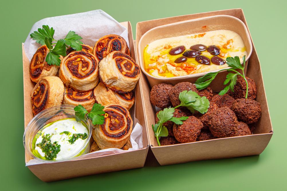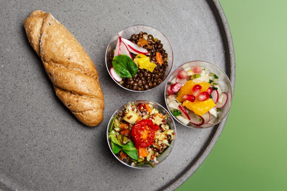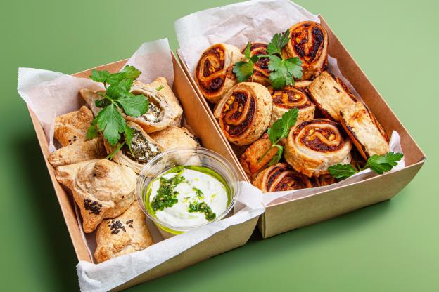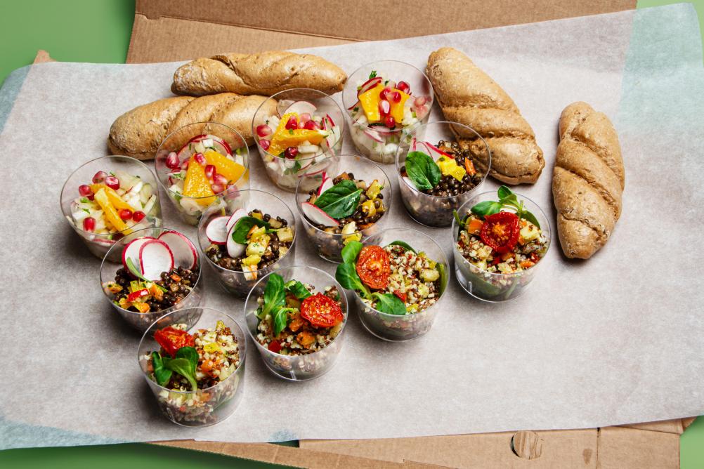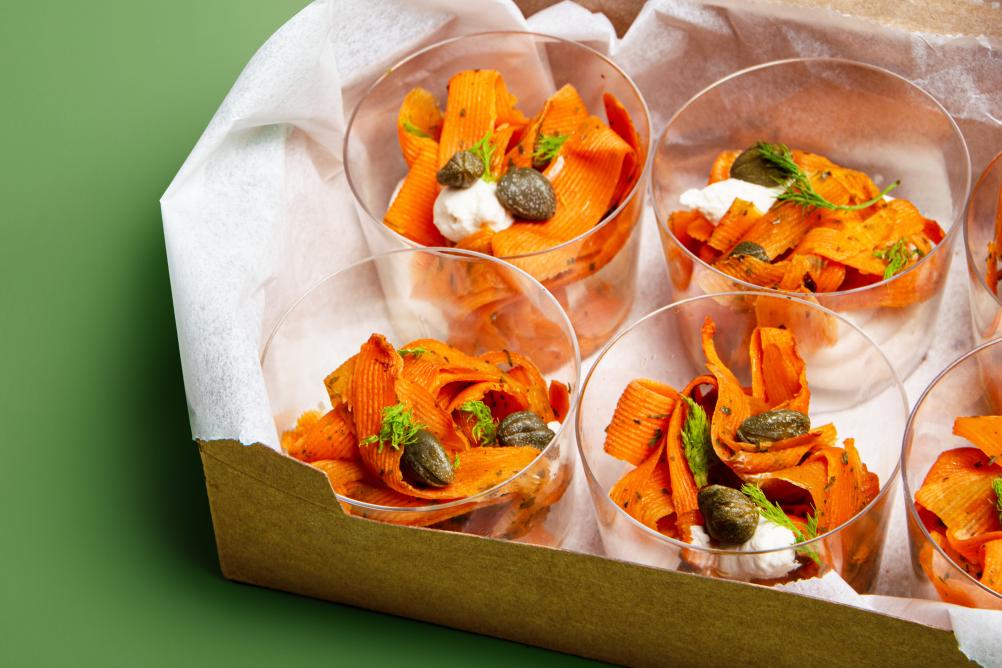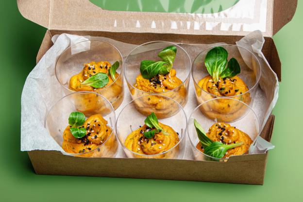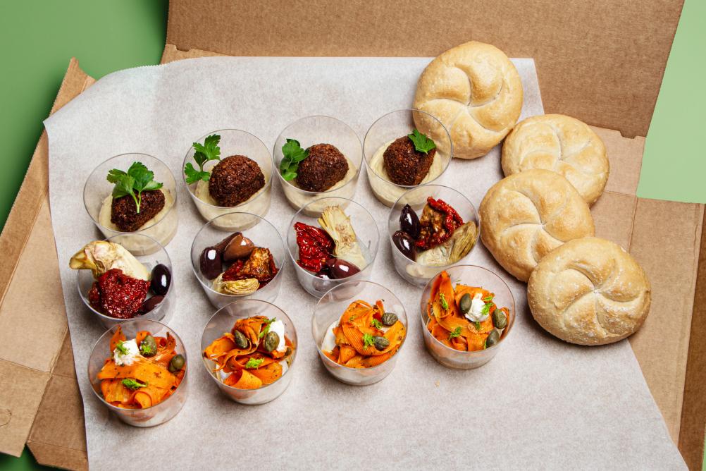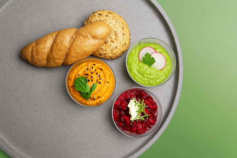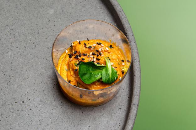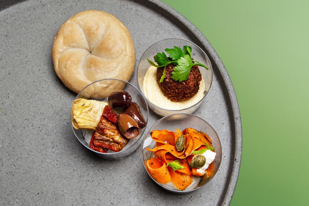 - BIO Kornspitz mit Hummus, Karotten Kokos Aufstrich, Karotte und Rucola (vegan, Allergene: A,N)