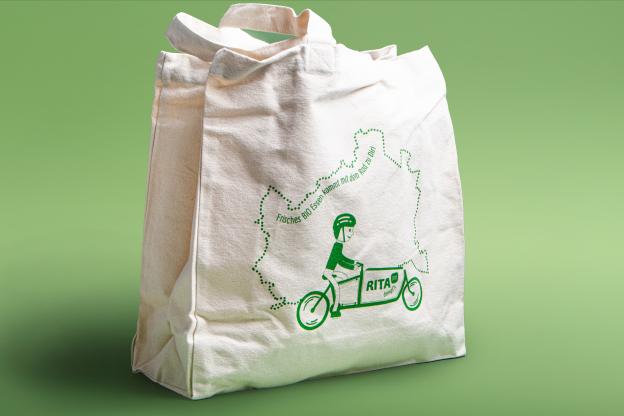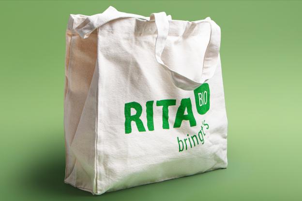 <p>Die Abbildung zeigt die Tasche mit ihrer Rückseite, vorne ist das RITA bringt's Logo aufgedruckt. Die Maße sind 37x41x14cm und sie ist aus Fair Trade Baumwolle