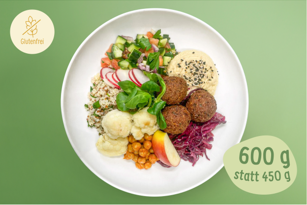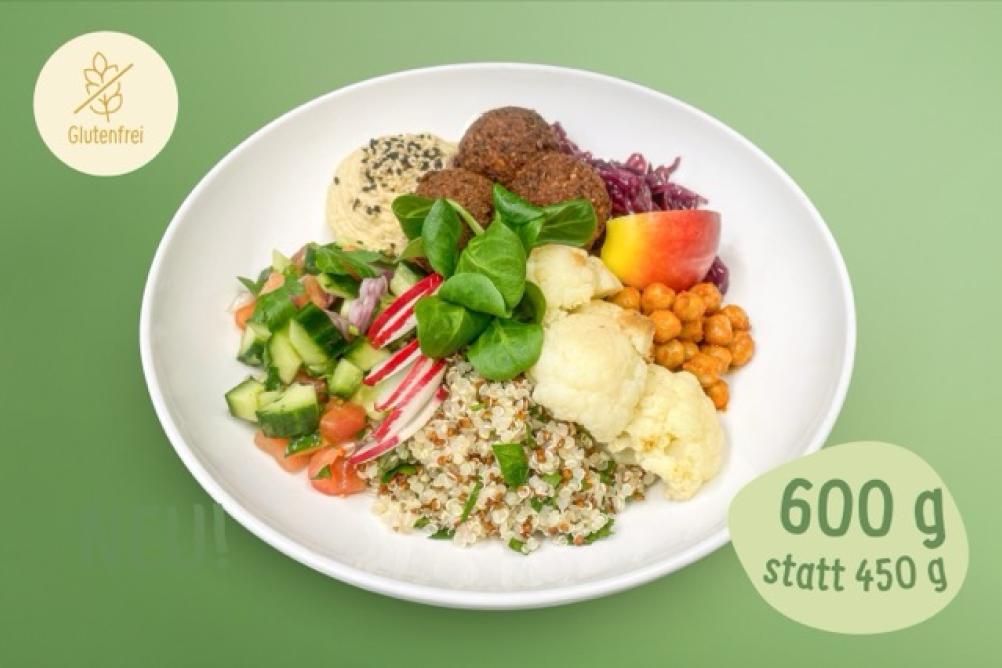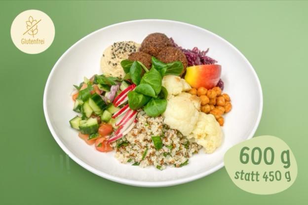 Vogerlsalat, Sesam, Obst (nach saisonaler Verfügbarkeit), Radieschen, Quinoa, Petersilie, Hummus (Kichererbsen, Tahin, Knoblauch, Olivenöl, Salz), 2 Stück Falafel (Kichererbsen, Zwiebel, Knoblauch, Kichererbsenmehl, Stärke, Petersilie, Gewürze, Rapsöl), Rotkraut, Weißweinessig, Gurke, Paradeiser, Karfiol (oder Brokkoli, nach Verfügbarkeit, alternativ Zucchini), Kichererbsen. Überall: Gewürze, Olivenöl, Zitrone, Salz.