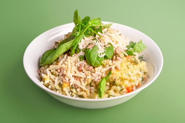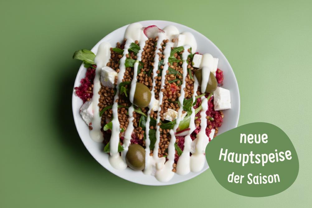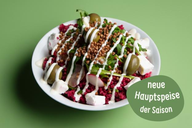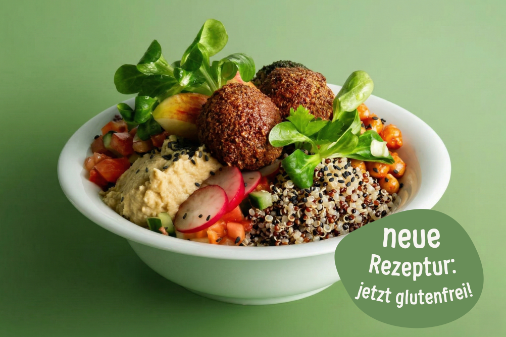 Vogerlsalat, Sesam, Obst (nach saisonaler Verfügbarkeit), Radieschen, Quinoa, Petersilie, Hummus (Kichererbsen, Tahin, Knoblauch, Olivenöl, Salz), 2 Stück Falafel (Kichererbsen, Zwiebel, Knoblauch, Kichererbsenmehl, Stärke, Petersilie, Gewürze, Rapsöl), Rotkraut, Weißweinessig, Gurke, Paradeiser, Karfiol (oder Brokkoli, nach Verfügbarkeit, alternativ Zucchini), Kichererbsen. Überall: Gewürze, Olivenöl, Zitrone, Salz.